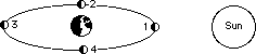 PHASES OF THE MOON: (1) "New Moon" - the Moon is between Earth and the Sun and the Nearside is in darkness while all of Farside is sunlit, full. (2) First Quarter or First Half Moon - the East half of Nearside and West half of Farside is sunlit. (3) "Full Moon" - all of Nearside is sunlit, all of Farside is in darkness. (4) Third Quarter or Second Half Moon - the West half of Nearside and the East half of Farside is sunlit.