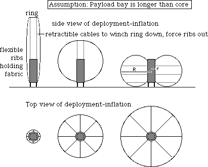 The assumption that the payload bay is longer than the core stack is not necessarily going to be the case. But if it were, the bulk of the fabric envelope could be packed forward of the core, giving the core room to be larger. The area immediately above the core complex and within the ring to which the ribs are attached and within the winch cables could also be packed with items if snagging could be avoided. - Just an idea that occurred to me. Keep in mind, that the basic idea behind the torus architecture with works core in the middle is to get the most deployable habitat volume out of the set constraint of the (whatever launch vehicle) payload bay size.