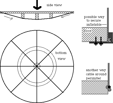 You make a very shallow cable and truss structure in which the cable produces enough tension to keep the floor flat despite the tremendous buildup of undistributed pressure at the center of the floor. In other words, the same kind of tension handling device they use to make bridge supports. An engineer would have to evaluate the stresses and make the final design. But this way, you might be able to have a hemispheric inflatable. Of course, the seal (and grab) of the inflatable to the floor system would have to be perfect, with no weaknesses.