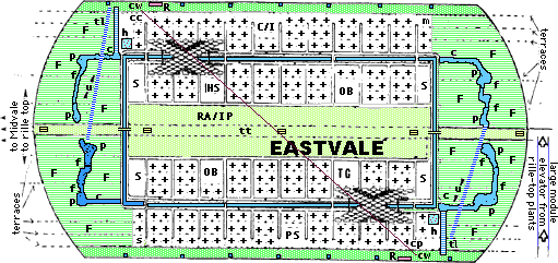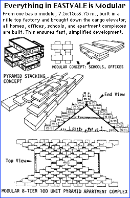 The determining idea behind the EASTVALE Plan is that module shells would be cast in a Rille top factory (at high temperature with the need for concentrated solar heat) probably of glass-glass composites (Glax*) of minimally refined formulation. With openings ready for fitting with standard window and door units, and with the interior surfaces ready for snap-in electrical service, these units would be brought down the rille slope in a pressurized cargo elevator (whose dimensions determine module size) to the central freight-transit corridor along the rille bottom. Next they'd move into the village for essential outfitting at a central plant, and then to the home-site etc. for erection and immediate occupancy.