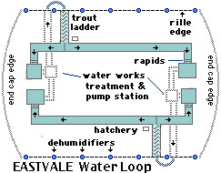 The plan for the first village, EASTVALE, was conceived by Peter Kokh. He chose a simple street plan with a closed loop boulevard, portions of which boast median canals, and 200 individual home sites, 2 100-unit apartment complexes, schools, offices, and other buildings all using a version of the same basic module.