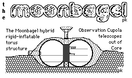The "donut" has since been more aptly dubbed "the Moonbagel" by LRS at-large member David A. Dunlop. The concept of a vertical works-core tailor-made for a cylindrical payload bay and pre-integrated with an inflatable sidewall torus seemed elegant. Previous writers dealing with inflatables commonly described spheres and cylinders. But on a gravid surface either needed to be stabilized upright - they were per se prone to roll. The torus, however had four considerable and unique advantages: